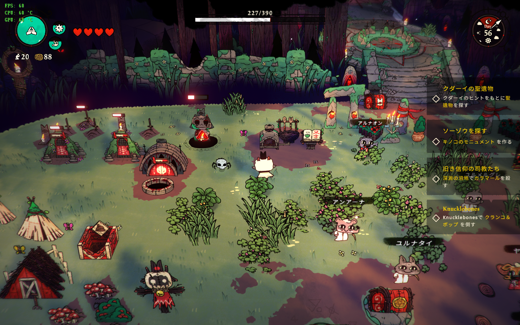 昨日のUnityの新料金体制発表からのCult of the Lambの2024年1月1日での配信終了宣言ニュースでそこそこに驚いてはいる。 discordでは「風刺」と言ってたらしいが、風刺の一言で終わるわけねーだろこれ絶対。 売上数やDL数の閾値はあるにせよ、それによって料金が加算されるってのは、下手すれば悪用されるパターンも出てくるわけで、Unityめっちゃ突っ込まれてるじゃん… CotLの配信終了が短気だというコメもあるけど、そういう悪用を懸念すれば、短気でも無いと個人的には思う。 (CotLのプラットフォームはPS5/PS4/Xbox/Switch/Steamと幅広いんだぜ…?そういう多プラットフォームで自動ツールとかでやられてみ?損害問題になるかもしれんじゃろ…) …なので、万が一本当に配信終了になった場合に備えて、今のうちに買っておきたい人のためのCotLの役に立た無さそうな教団運営ポイントまとめた。適当に(こら) 前の適当なレビューはコチラ 【食糧問題】 雑草が有り余ってどうしようもない。肉や魚、野菜が集まりにくい…という教祖様は「食生活」の特性「草食」を取ると良いでしょう。 雑草は聖戦中割りとゲットするものだし、余剰分に困るならまずはコレ。 金貨とか種や畑に余裕ができれば、魚は買えたりするし野菜とかも育てられるけど、序盤の食糧問題はとりあえず雑草料理でなんとか切り抜けられはする。 「草食」にすると雑草料理のデメリットが消えるので利用しやすい。失敗もしなくなる。 まさに「そこらへんの雑草でも食わせておけ!」状態になってしまうのだが気にしたら負けなのである。 信者が餓死しなければ飯なんて何でも良いんだよ。とてつもない偏食嗜好な信者も偶にいるけど。 草食が嫌という教祖様はもう一つの選択肢を選ぶのもまた一興… (これはプレイヤーの心情に委ねられる選択でもある。食料と信仰の両方は得られるが) 【一部作業の自動化】 基本的に信者の食事と死体処理、トイレの世話なんかは教祖であるプレイヤーがすることになるけど、一部は信者にも任せられるようにはなってるので、早々にそういったものをメインにあんロックしていくと幾分こっちの作業が楽になる感じ。 食事も、教団のレベルが上がるとキッチンがアンロックできるようになるんで、食材を適当に放り込んでおけば信者が作ってくれる(はず) 信者が死亡した際は死体はそのまま放置されたままになるけど、安置所を作っておけばそこまでは勝手に運んでくれる。 そのあとの埋葬か別件処理(あえてごまかす)は自分でやらないとダメなんだけど。 (集団墓地とかの近くに置いておくと作業がしやすい) 施設などをアンロックしてくいと、一部の作業を信者が変わりにやってくれたりするので、自分が欲しい物を優先的に取っていくのも良いかと思われ。 畑は早めに取っておくと聖戦とかで種とか取れるんで、食料も増えていくし、コンポスターとかそういったものも準備アンロックしていけば、畑の方はほぼほぼ育ててもらいたい種を入れるだけのお仕事に変わる。楽ちん。 中盤以降になるといい素材も手に入ったりするので、畑は早々にアップグレードを勧めていくと良いかもね。 【信仰が減りすぎてヤバいです…】 洗 脳 し ろ 食生活の「キノコ推奨論者」は取っておくと良い。 保険として診療所を建てておいてね。 洗脳の儀式はソーゾウ様のイベントをクリアしていく必要があるので、最初からは選べないけど、中盤以降は聖戦途中で信者を病気だとか裏切りをさせてくるボスがいるので、信仰の増減に注意しないとヤバい事になるときも出てくる。 毎日の説教もそうだし、聖戦に勝つことでも信仰は増えるから、頑張っていきましょう。 【たけのこ派です】 大きな篝火焚くか、祝宴または祝日の儀式でもして。 (祝日の儀式をすると信者みんな仕事休むから、リソース確保も忘れずに) 祝宴の儀式だと信仰も増えてお腹も膨れるので、きのこ派の教祖様もぜひに。 あとは信者に祝福を授けまくるとか。 周辺に複数の信者がいると巻き添え食らわすことができるので、集団でいるところを狙って一緒に踊ったりするとよろし。 【Knucklebonesに勝てません】 基 本 的 に 運 ゲ ー で す 大きい目のダイスをできるだけ一列に並べて倍々にしていくは完全に運だよな運。 あと、信者はスキンが徐々に増えていくので、好きな名前(日本語可)とスキンで自分好みの信者にしてみてね(-д☆)キラッ |